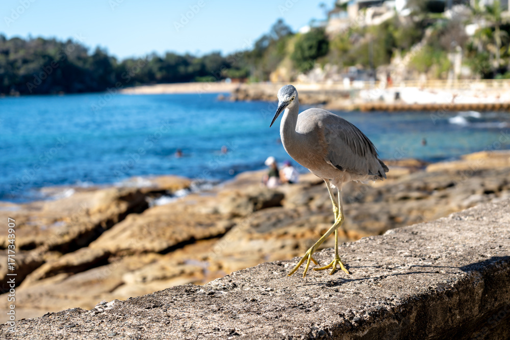 White-faced heron walking along Manly Beach coastline in Sydney, Australia