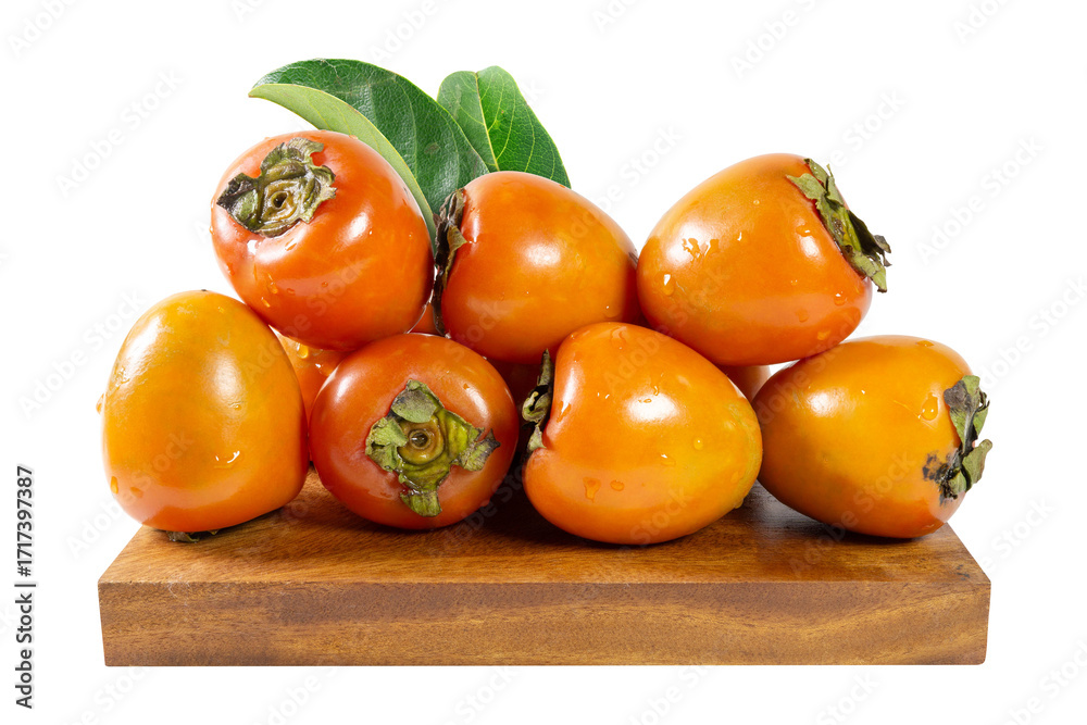 Ripe, shiny persimmons with leafy tops, glistening with water droplets. Placed on white background.