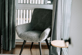 Cozy modern chair beside a window with curtains in a stylish interior space