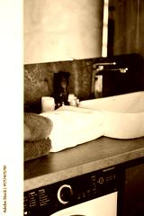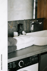Modern bathroom with clean towels and elegant sink design in a minimalist space