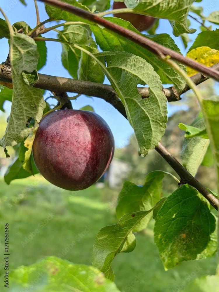 An apple on an apple tree branch. The sweet red fruit grows in the garden.