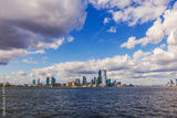 Hudson River with modern Jersey City skyline on background and dramatic cloudy blue sky. New York. USA.