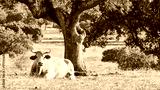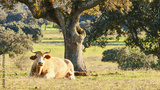 Charolais cow resting in spanish dehesa under stone oak 049,050