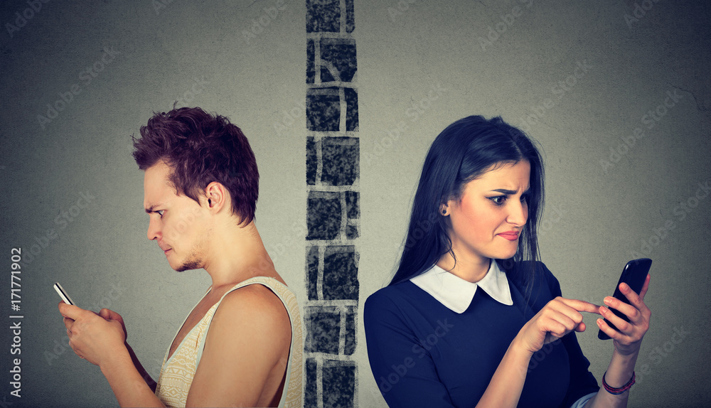 Angry couple upset man and woman separated by wall tasting each other on mobile phone