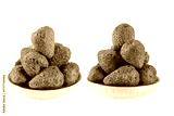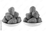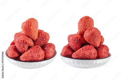 Two white bowls are filled with vibrant red, freeze-dried strawberries, their porous texture preserving a healthy, appealing snack.