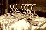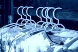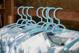 close-up shot of tie-dye t-shirts hanging on light blue plastic hangers. The shirts feature a soft, pastel tie-dye pattern.