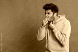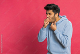 Unhealthy Indian young man coughing covering mouth with hand feeling sick, allergy or viral infection disease symptoms, infection, pain, virus. Hispanic Hindu guy isolated on red studio background