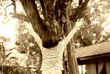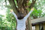 Happy woman with open arms embracing nature under large tree in sunny garden. Natural healing therapy. Social media detox retreat at eco hotel. Nature connection wellness at sustainable eco retreat.