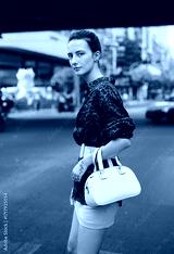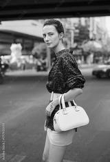 A stylish girl in an urban setting, a fashion shoot with a model. Leopard print and a pink bag.