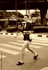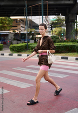 A stylish girl in an urban setting, a fashion shoot with a model. Leopard print and a pink bag.