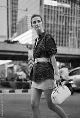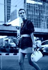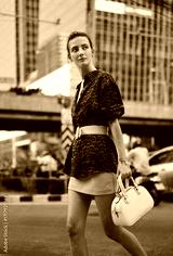 A stylish girl in an urban setting, a fashion shoot with a model. Leopard print and a pink bag.