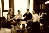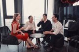 Group of business professionals having casual conversation and networking in modern office lounge with city view..