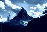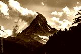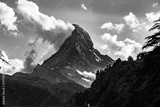 Black and white view of Zermatt village with the Matterhorn in the Swiss Alps