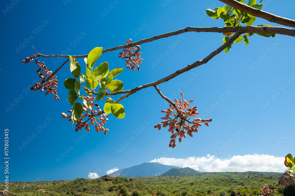 Closeup view of a pistachio bunch on tree during harvest time in Bronte, Sicily, and Mount Etna in the distance