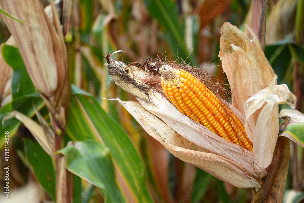 Corn cob in the cornfield at harvest time