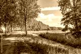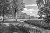 Sandy path between tall trees in a picturesque Dutch landscape. It's a sunny day with a few white clouds in the blue sky.