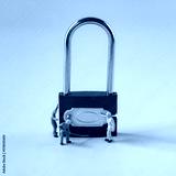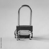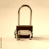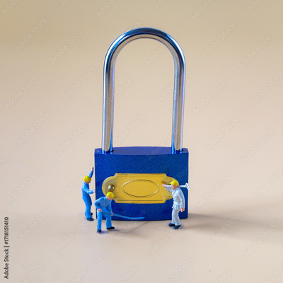 Locked Blue Padlock with worker model on the color background.
