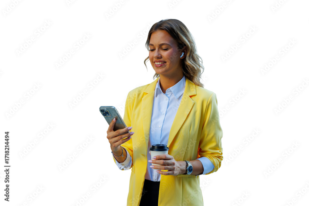 Professional woman in yellow blazer smiling, using smartphone with earbud, holding coffee cup, transparent background