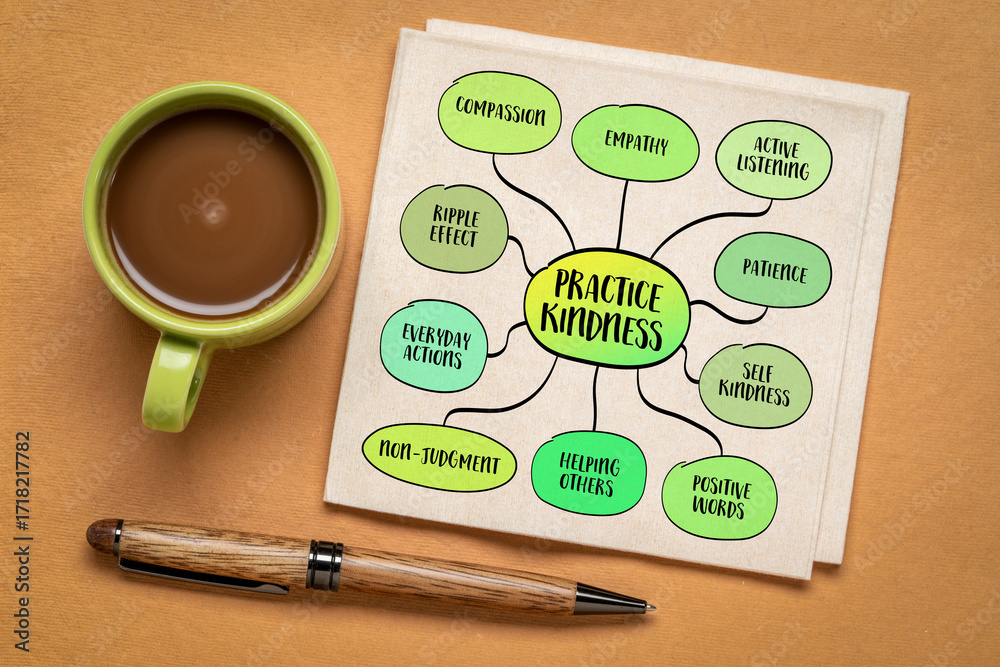 Practice kindness concept. Kindness is often mistaken for weakness - but in truth, it takes strength, intention, and courage to be kind. Infographics mind map sketch.