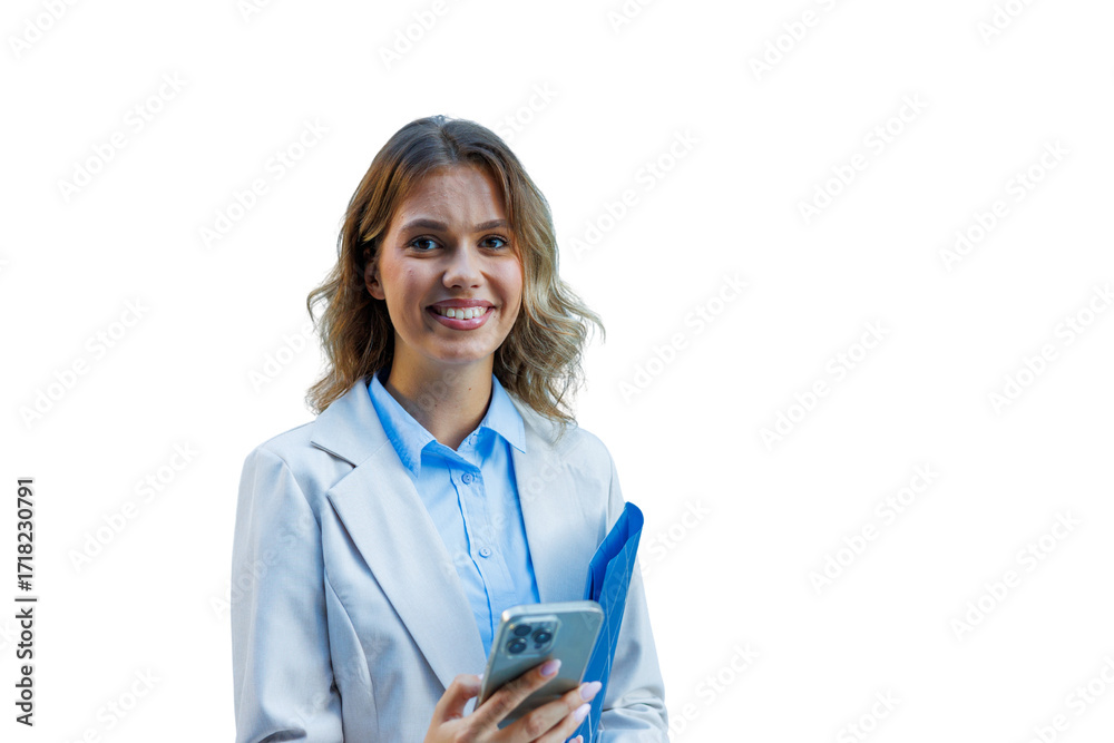 Young businesswoman smiling, holding a smartphone and folder, standing with a transparent background