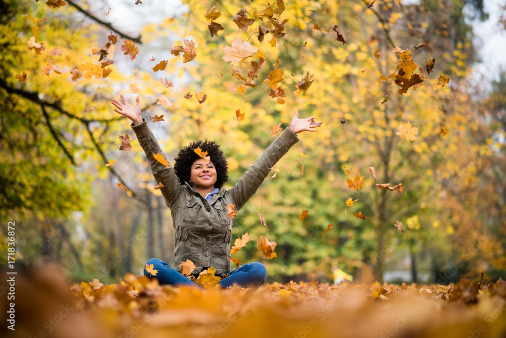 Teenage girl having fun during autumn season