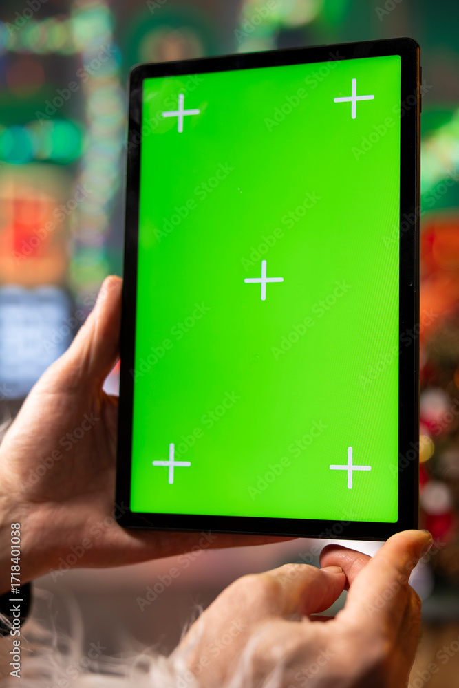 Close up of Santa Claus typing on mockup tablet touchscreen to reply to Christmas requests sent online by children. Saint Nicholas looking at green screen device display to check email inbox