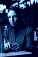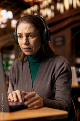 Female student participates in an online class via laptop in a campus library, engaged in a video conference lecture while researching for a thesis and studying for academic qualifications.