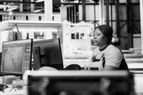 Engineer using computer setup to monitor solar panel plant assembly lines, troubleshooting photovoltaic system to ensure seamless production line. Automation for renewable energy.