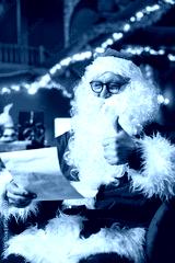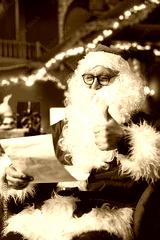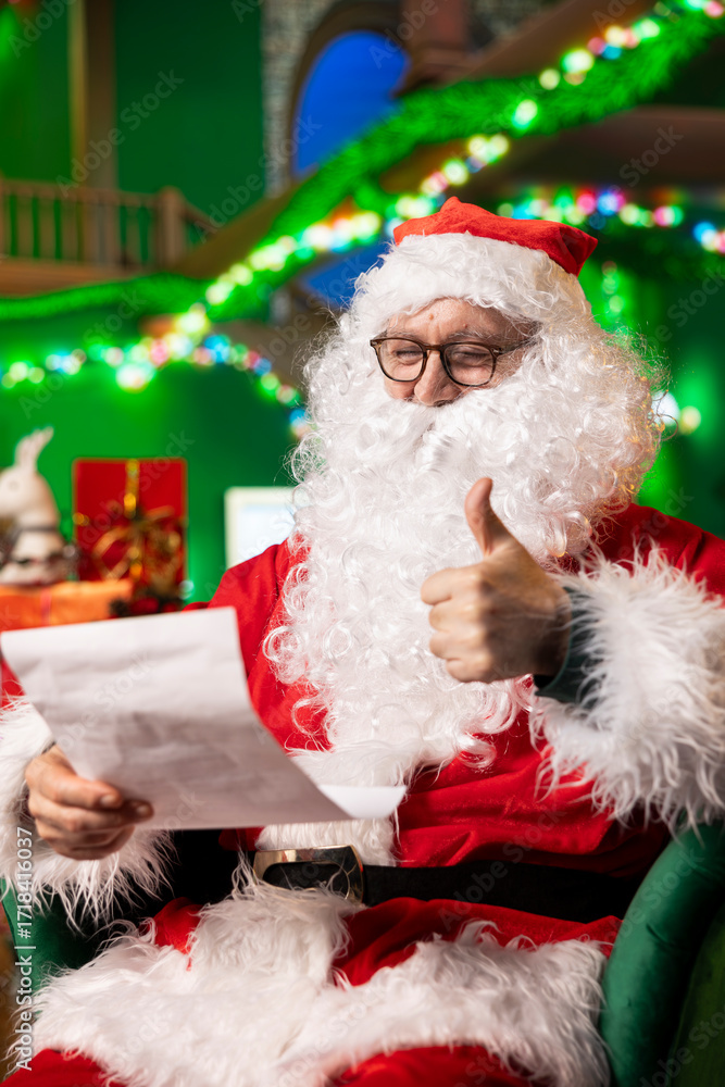 Joyous actor playing Santa Claus role opening letters from kids asking for presents, doing thumbs up sign. Cheerful senior performer reading gift wish lists from children, doing positive hand gesture