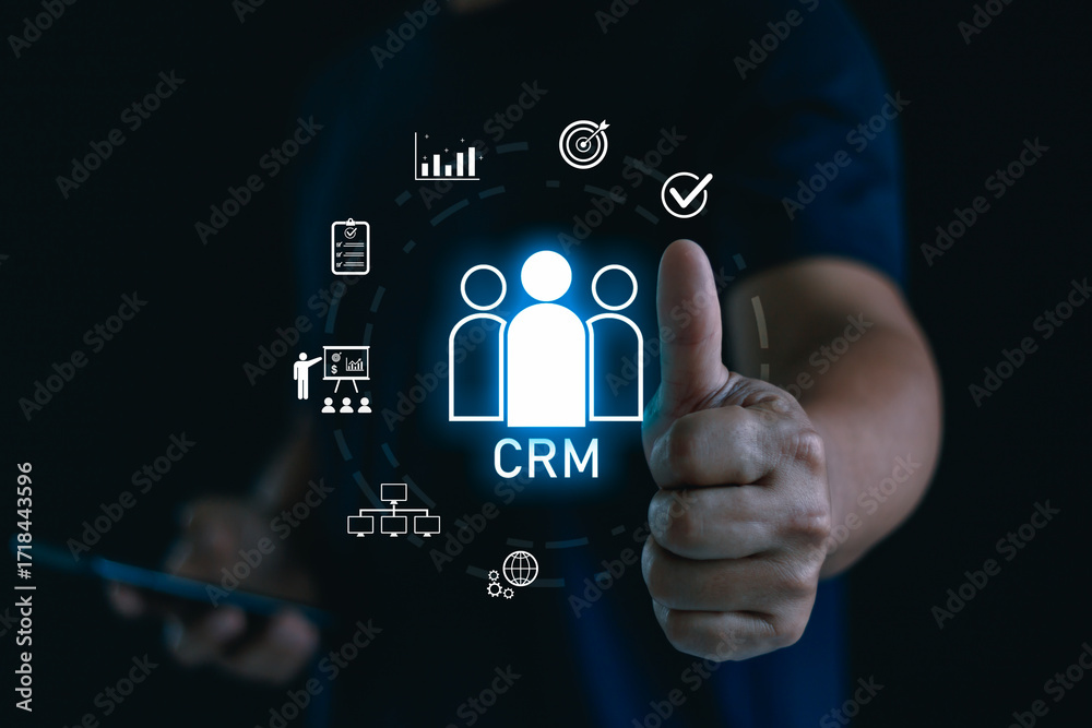 Man hand thumbs up gesture with CRM icon and marketing analytics symbols, representing customer relationship management, data-driven marketing strategy, client engagement and business growth solutions