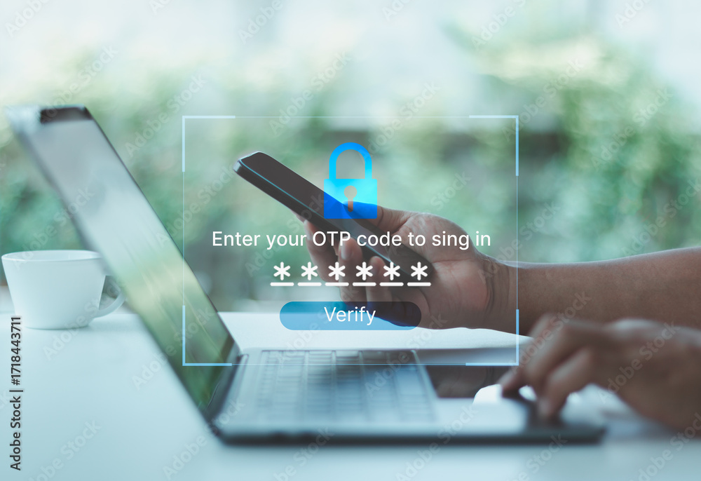 Man holding smartphone and entering OTP code on laptop for two-factor authentication, illustrating cybersecurity, secure login, identity verification and online business account protection concept.