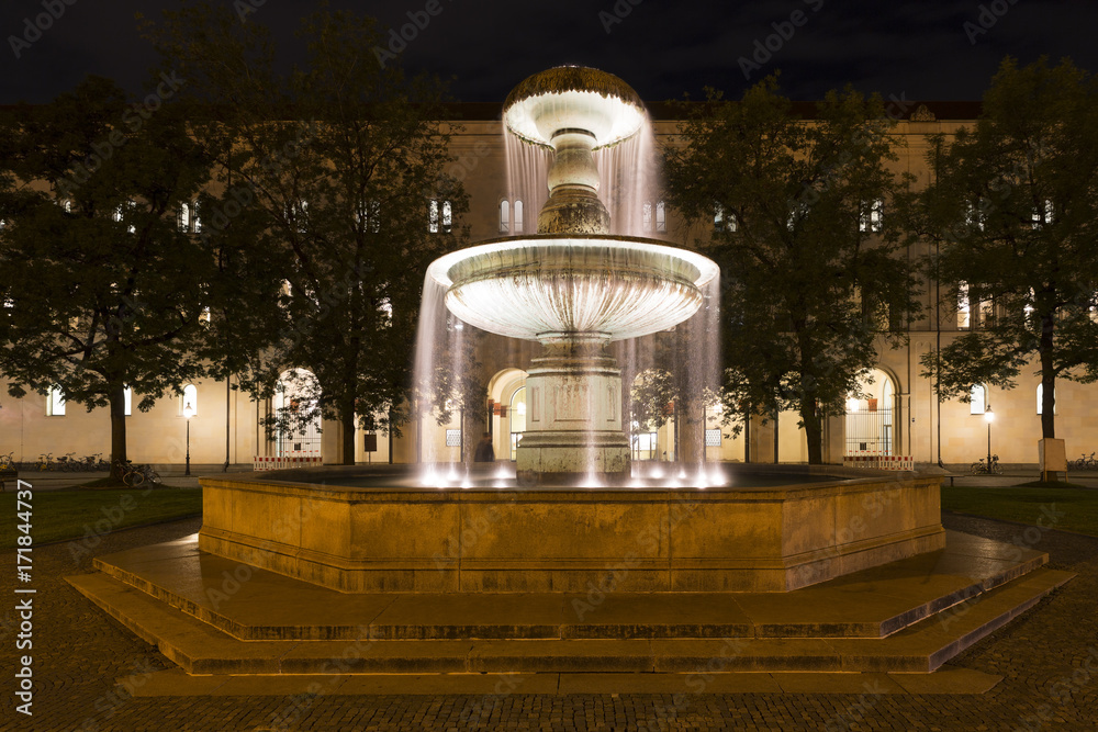 Beleuchteter Brunnen am Geschwister-Scholl-Platz in München
