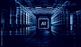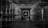 AI infrastructure. Servers in data center. Equipment for artificial intelligence. AI logo near computer equipment. Infrastructure for neural networks concept. AI technologies. 3d image