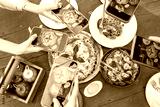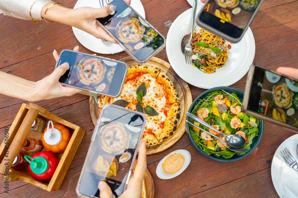 Group of Happy Asian man and woman using mobile phone taking picture food and drink on dining table. People friends enjoy and fun meeting celebration holiday event dinner party together in the garden.