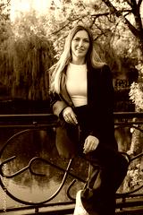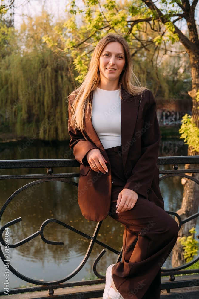 Outdoor leisure. Carefree weekend. Cheerful confident relaxed business woman posing in autumn natural park.