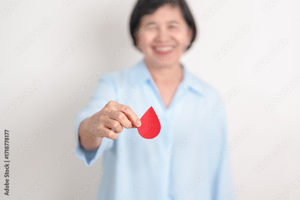 Elderly woman in blue shirt with red Blood drop for World Diabetes Day, Blue November Health month, Diabetes awareness, Blood sugar check, Insulin, Glucose screening, blood donoo and Health checkup