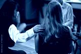 Supportive therapy session with a woman placing a comforting hand on another participant shoulder