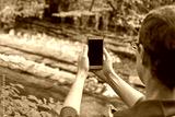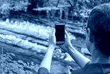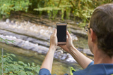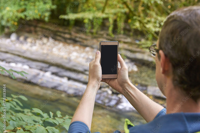 Caucasian male adult taking photo of scenic river with smartphone in forest setting.