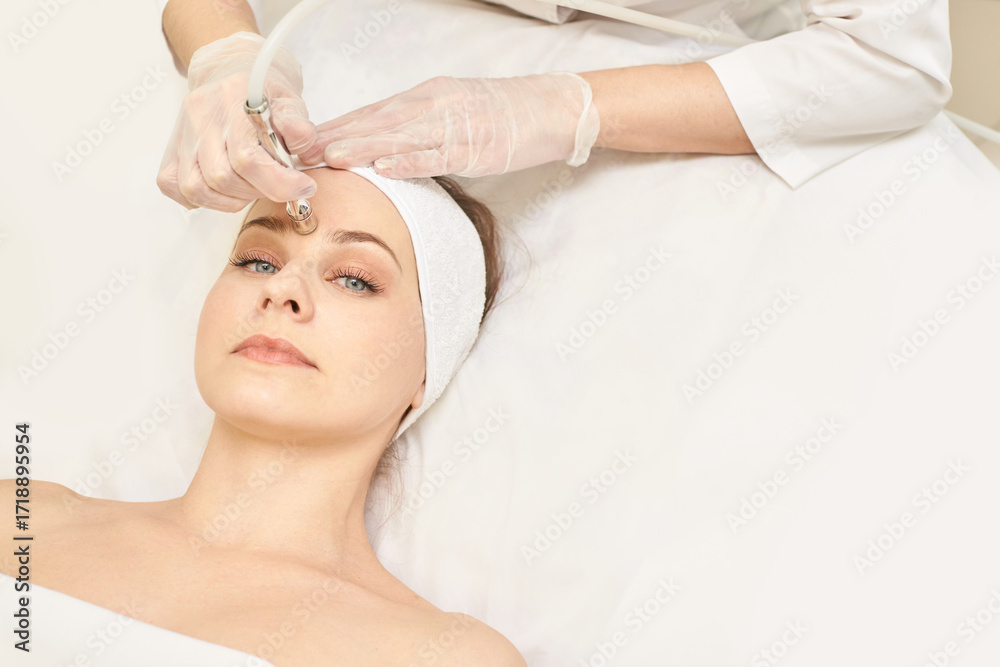 Young caucasian female receiving microdermabrasion facial treatment at spa clinic for skin rejuvenation.