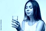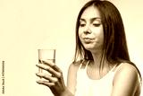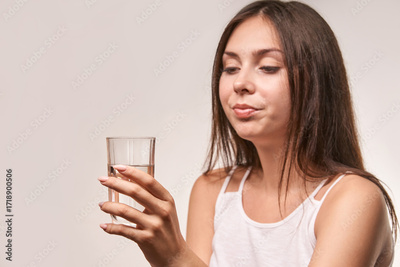 Young caucasian female holding a glass of water in hand while wearing a white top on a neutral background.