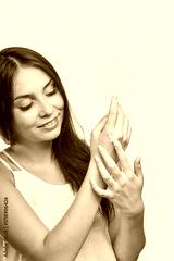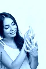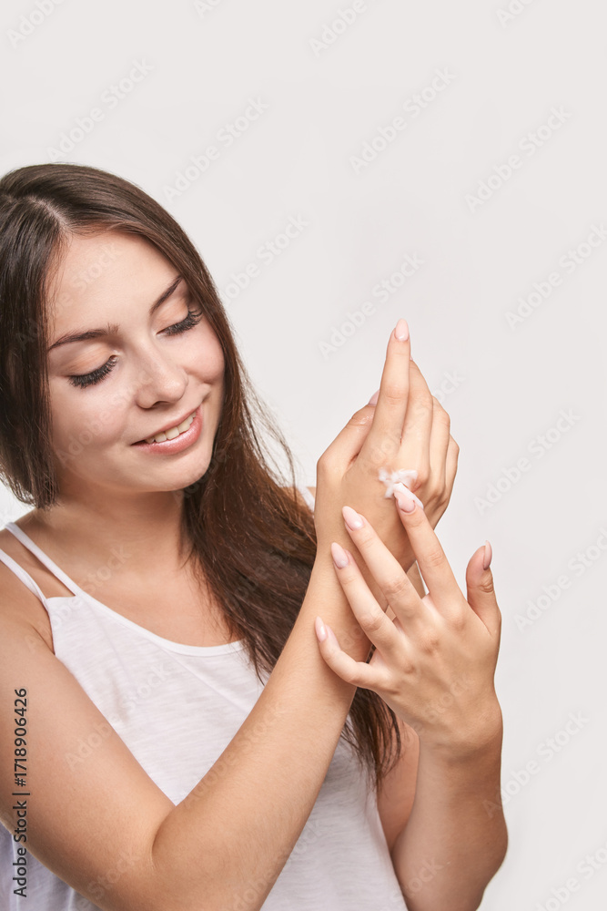 Young hispanic female applying moisturizer to hand in white tank top with brown hair.