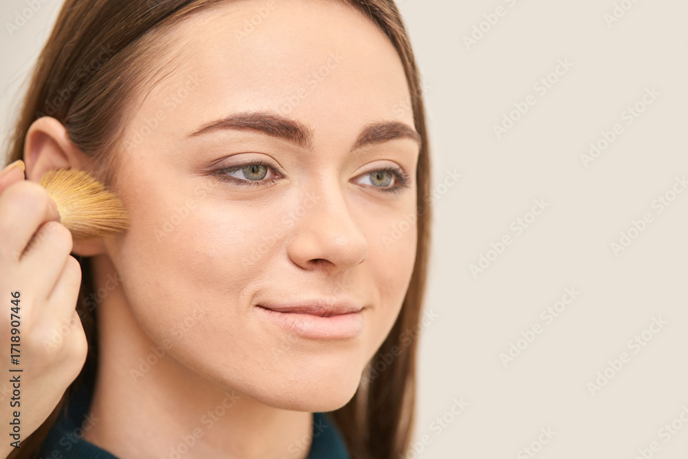 Young caucasian female receiving makeup application with soft brush on face closeup.