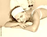 Young caucasian female receiving relaxing spa treatment with facial expression of contentment in tranquil setting.
