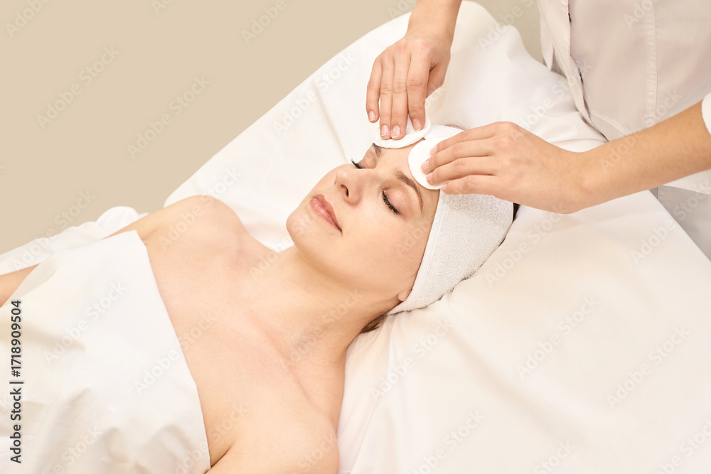 Young caucasian female receiving skincare treatment at spa with relaxing atmosphere and professional care.