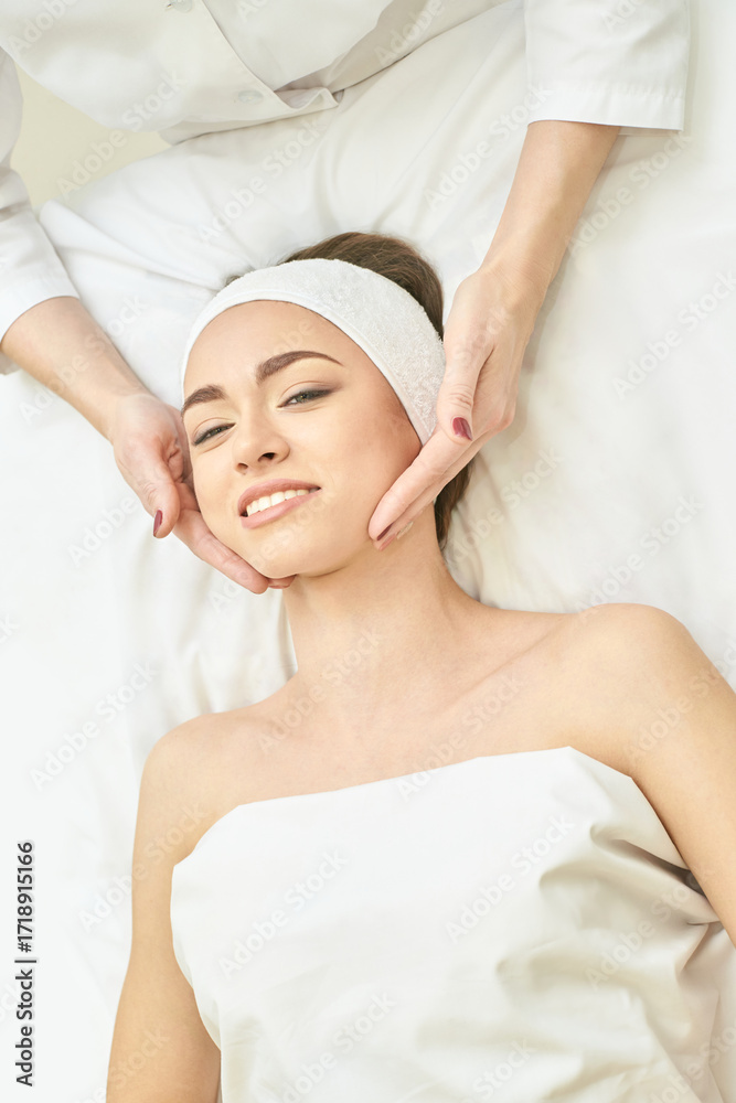 Young caucasian female receiving relaxing facial massage in spa setting promoting wellness and skincare.