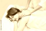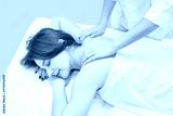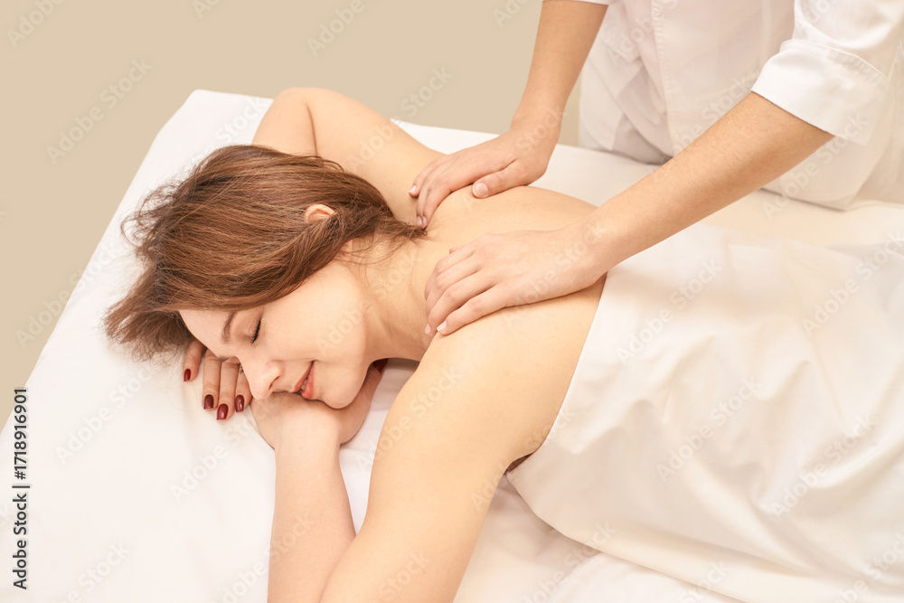 Caucasian young adult female enjoying relaxing massage therapy lying on a massage table, covered with a white sheet, serene and peaceful expression.