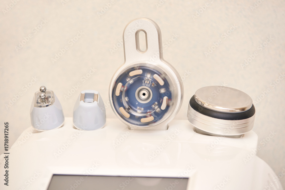 Advanced skin care device with multiple attachments for facial treatments in modern aesthetic clinic.