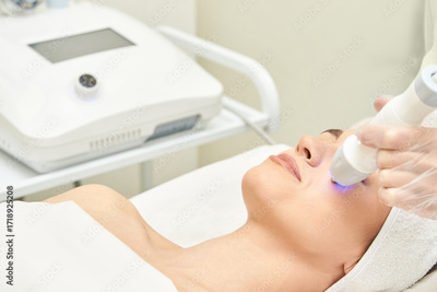 Female caucasian adult receiving facial treatment with modern skin care technology in a spa setting.