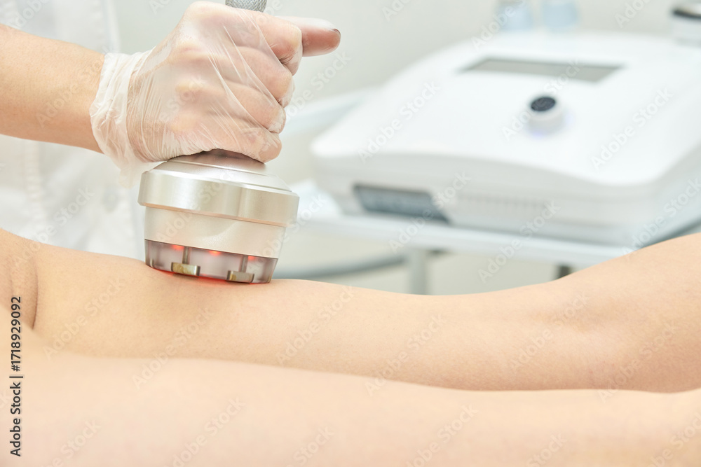 Female leg receiving professional anti-cellulite treatment using modern equipment in beauty clinic setting.