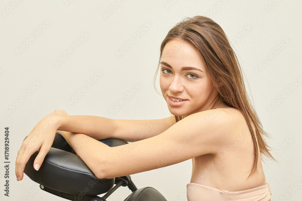 Young caucasian female relaxing on massage chair with calm expression in wellness setting.